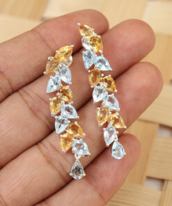 925 Sterling Silver Citrine With Blue Topaz Gemstone Earring New Design Leaf Shape Drop Earring